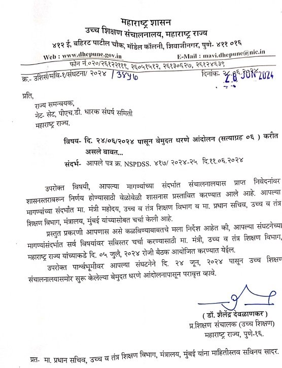 5 June Meeting संचालक ,उच्च शिक्षण पुणे यांच्या कार्यालय समोर संघर्ष समितीने सुरू केलेल्या आंदोलनाला उच्च शिक्षण संचालनयाने व उच्च व तंत्र शिक्षण विभागाने सकारात्मक प्रतिसाद दिला. या मुळे सुरू असणारे आंदोलन 30 जुलै 2024 पर्यंत स्थगित करण्याचा निर्णय घेण्यात आला. 30 जुलै पर्यंत प्राध्यापक रिक्त पद भरतीचा शासन निर्णय न आल्यास "बेरोजगारांची वारी मुख्यमंत्र्यांच्या दारी " असे आंदोलन 1 ऑगस्ट 2024 पासून संचालक उच्च शिक्षण , पुणे यांचे कार्यालयं ते मुख्यमंत्री यांचे शासकीय निवासस्थान वर्षा, मुंबई पर्यंत सुरू करण्याचा इशारा नेट - सेट,पीएच.डी.धारक संघर्ष समिती द्वारे देण्यात आला.